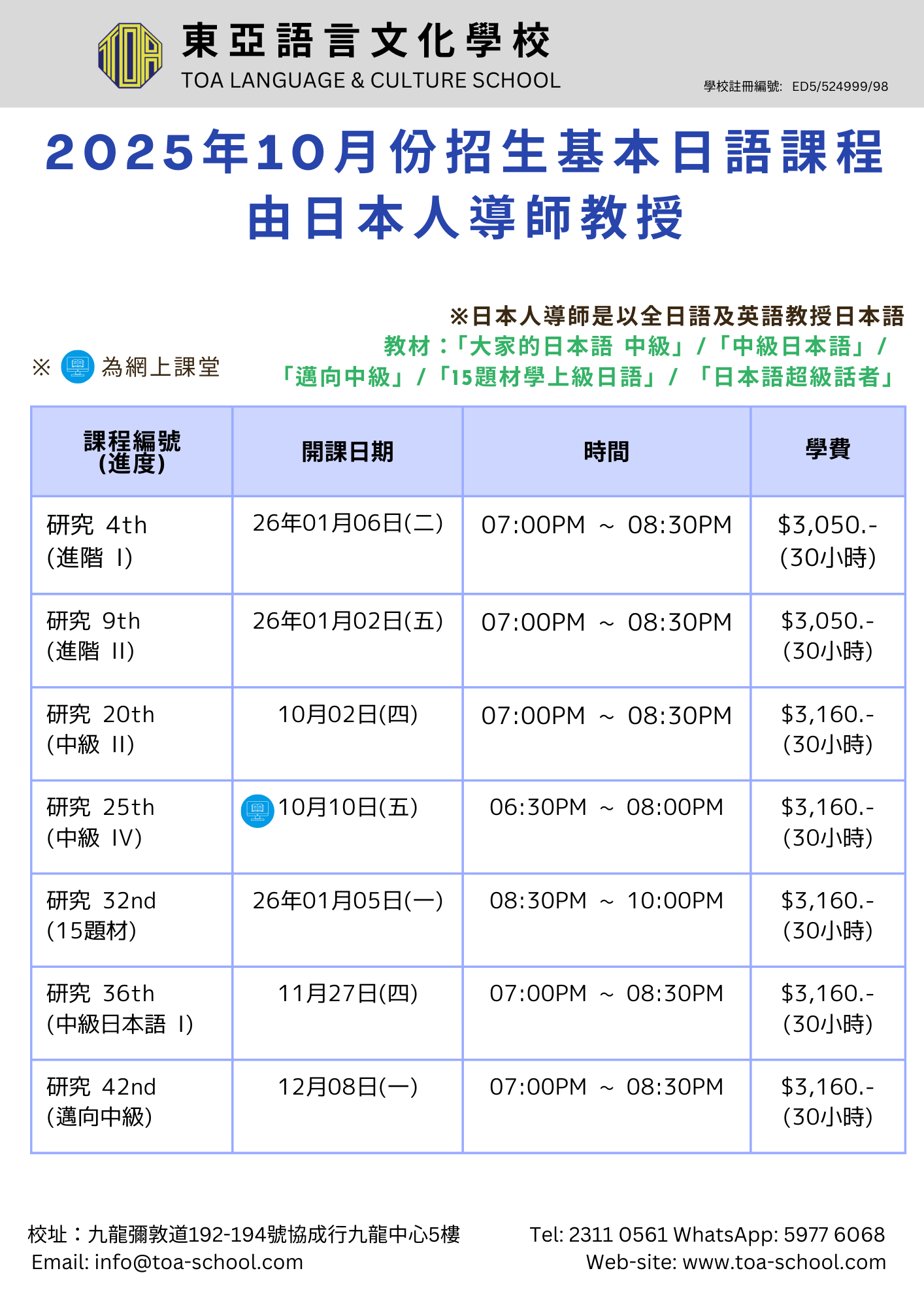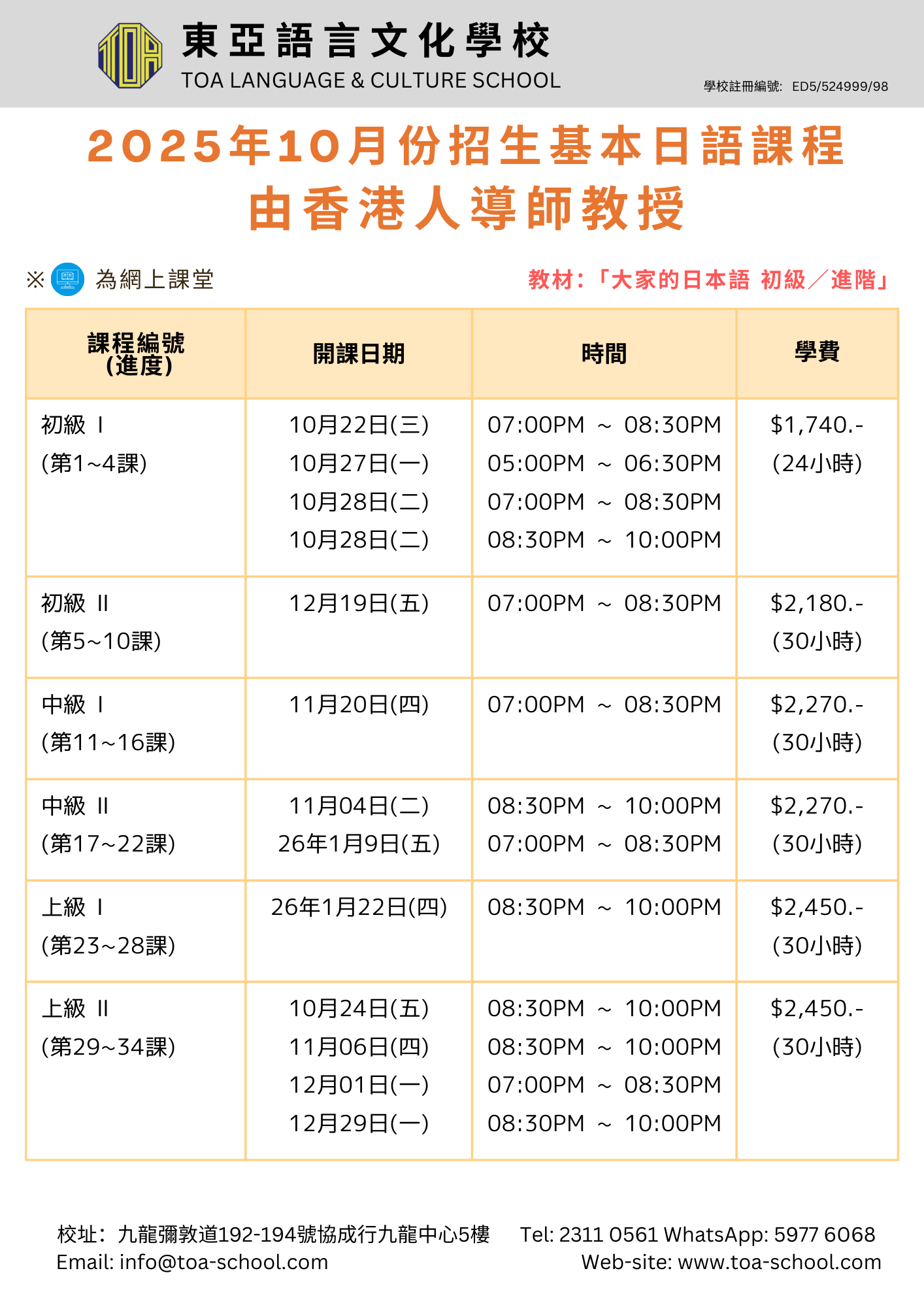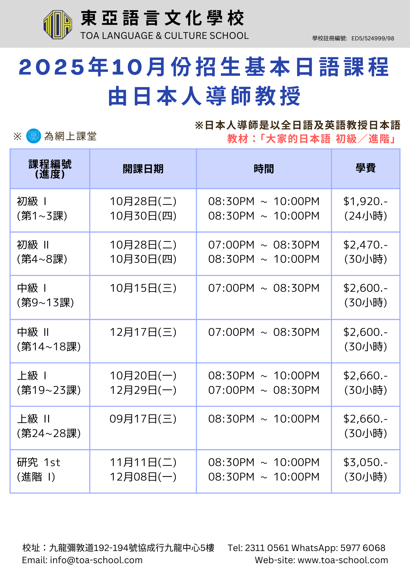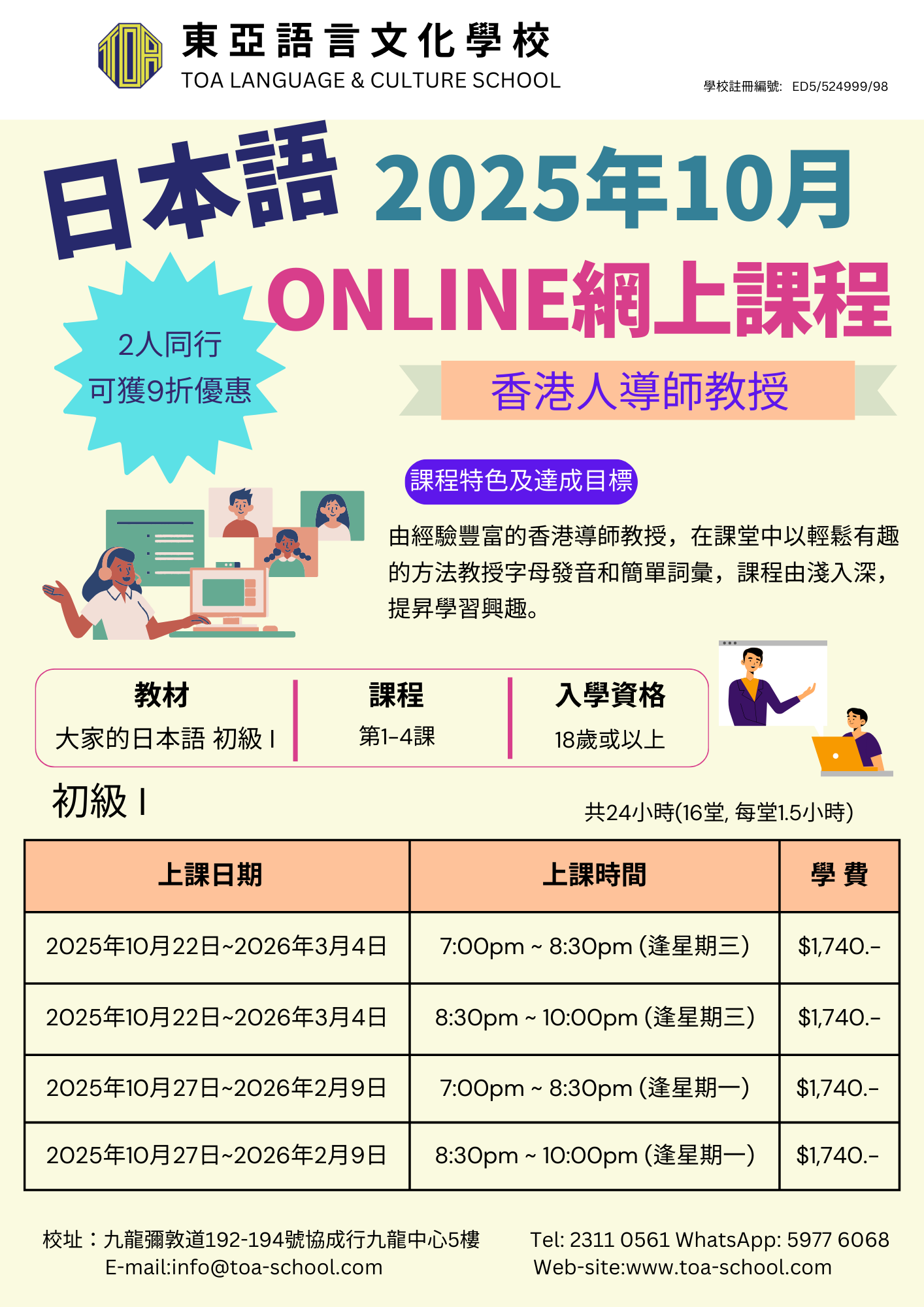 開始招10月生!/10月生募集スタート! 2025.09.30 開始招10月生!/10月生募集スタート! <中文> 報名及查詢, 請按 聯絡我們 或 入學報名 。 歡迎隨時插班! 若不確定適合的課程, 先可以參加 免費日語測試&諮詢【已學習日語的任何人士(包括小童及青少年)】了解自己的程度。 通過以下方式, 也歡迎聯絡致本校。 info@toa-school.com 23110561 59776068 <日文> 聯絡我們(日本人向けコースの方のお問合せ先) からお問い合わせ、お申し込みください。日本人スタッフが日本語で対応いたします。 途中入校も大歓迎! まずは希望の時間とレベルをご相談ください。 メッセージ、お電話でもお問い合わせいただけます。 info@toa-school.com 23110561 59776068 タイトルとURLをコピーしました