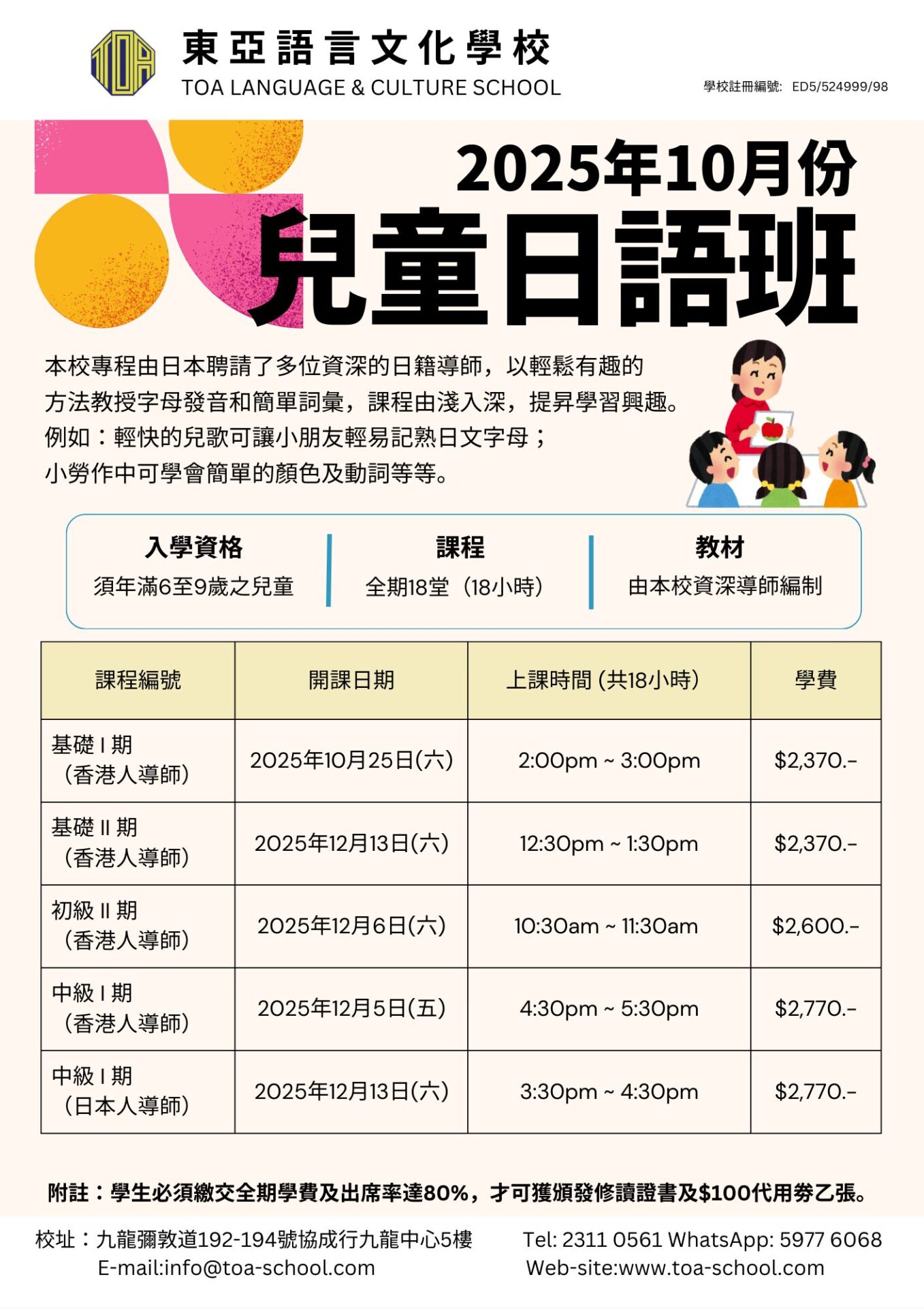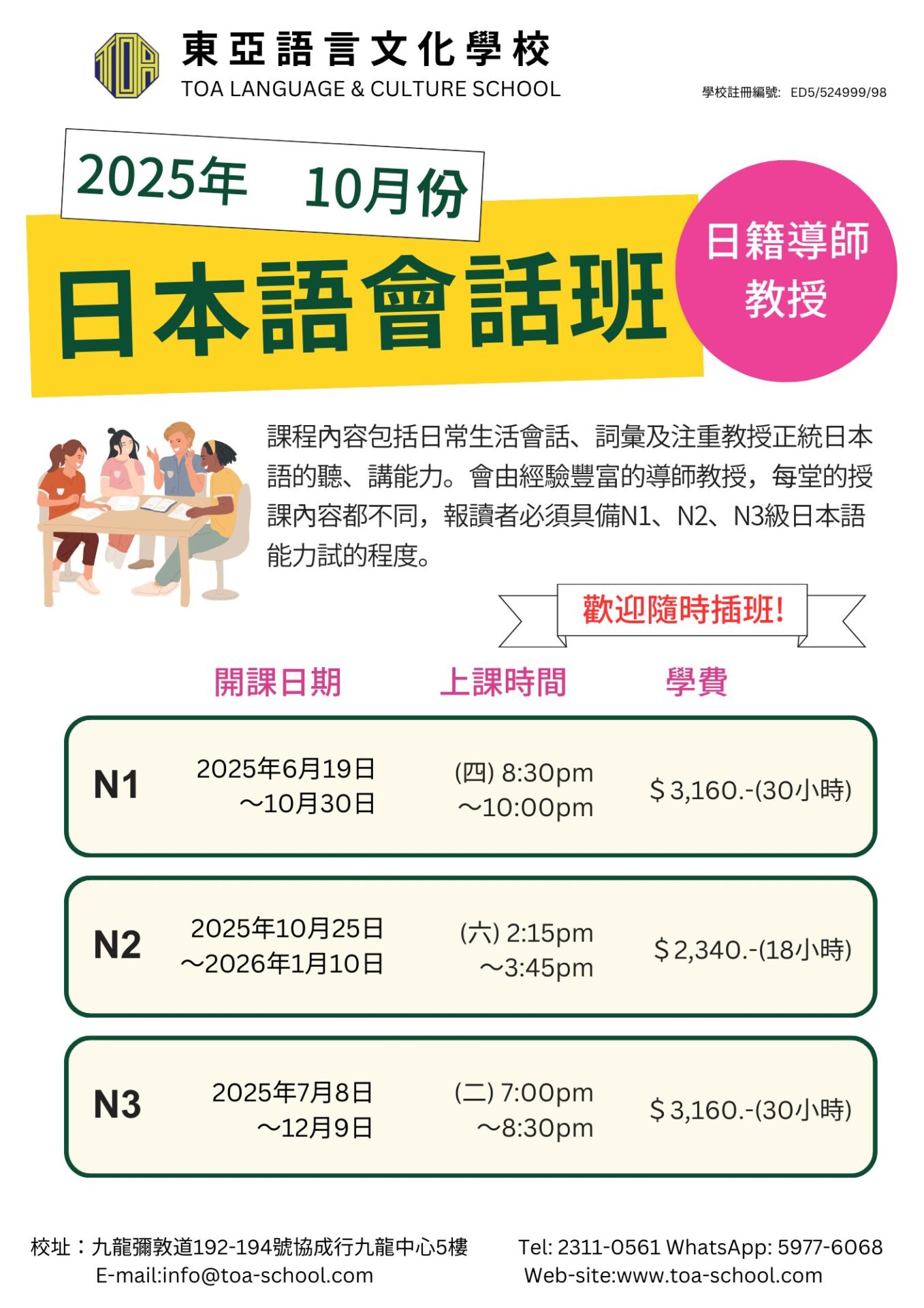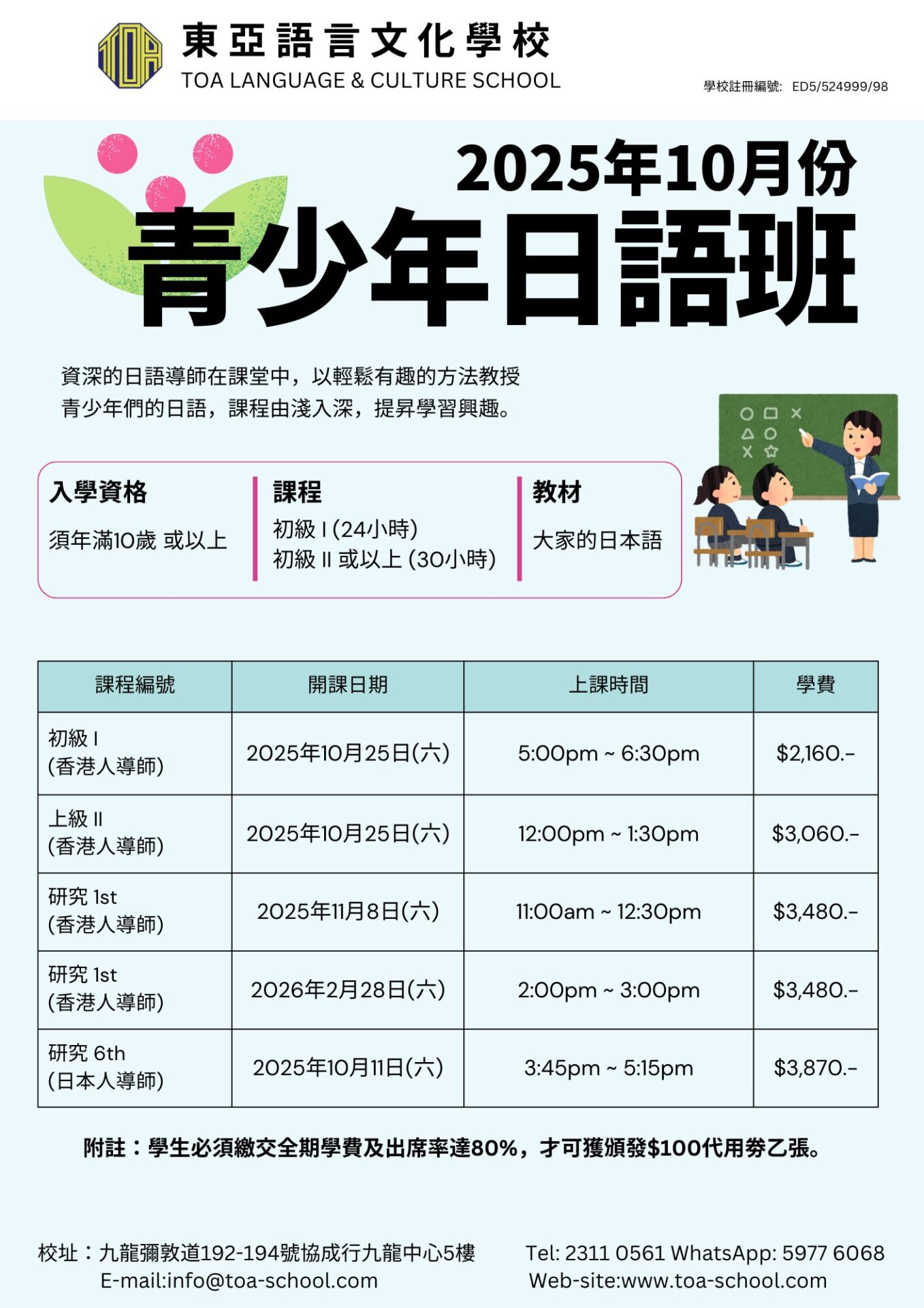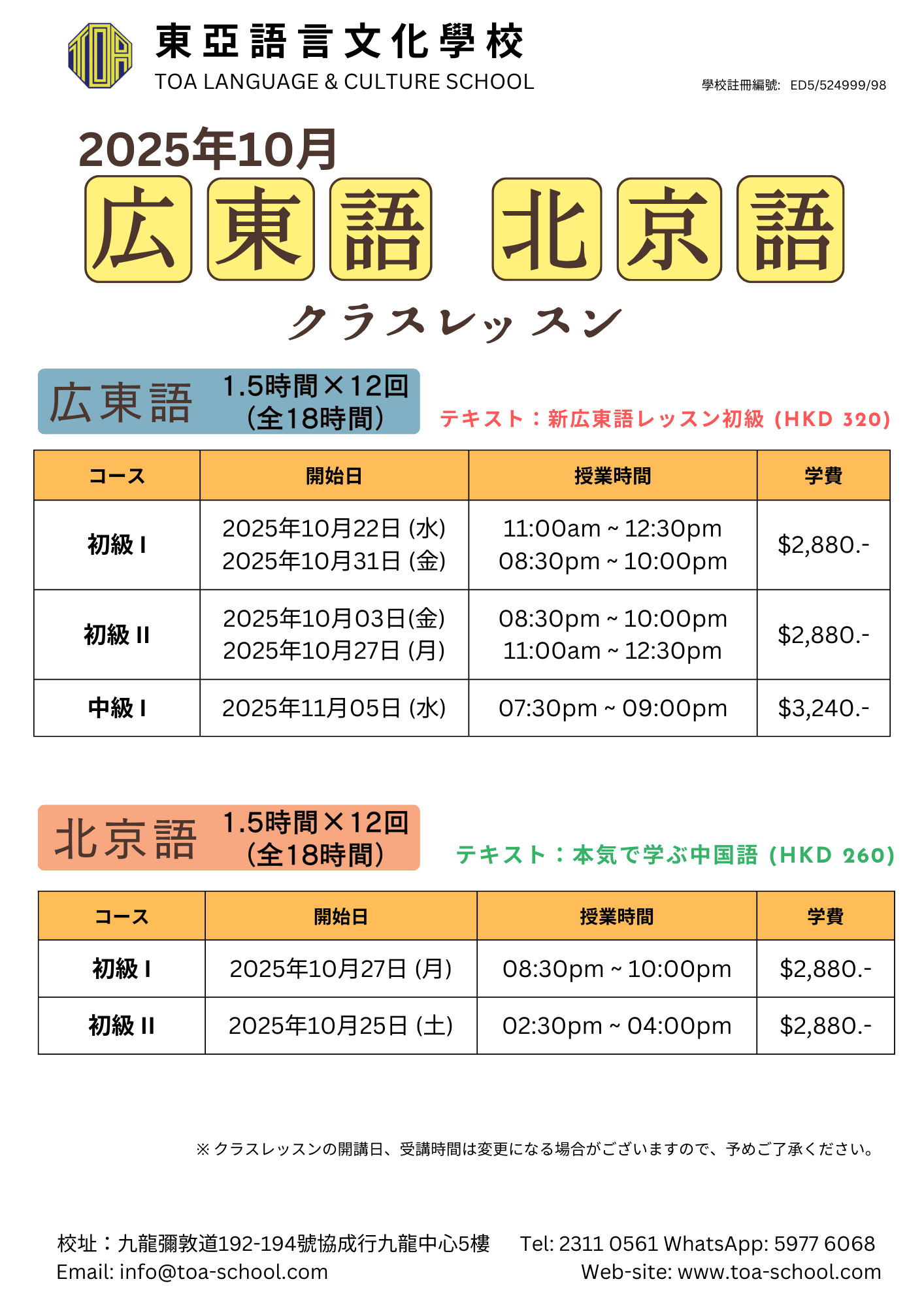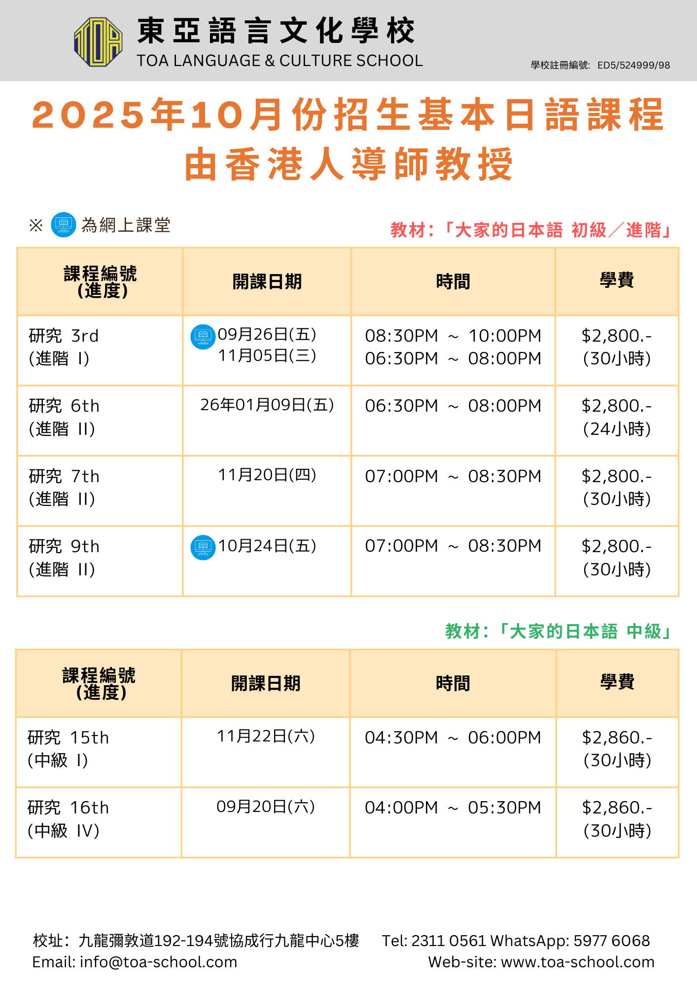 開始招10月生!/10月生募集スタート! 2025.09.30 開始招10月生!/10月生募集スタート! <中文> 報名及查詢, 請按 聯絡我們 或 入學報名 。 歡迎隨時插班! 若不確定適合的課程, 先可以參加 免費日語測試&諮詢【已學習日語的任何人士(包括小童及青少年)】了解自己的程度。 通過以下方式, 也歡迎聯絡致本校。 info@toa-school.com 23110561 59776068 <日文> 聯絡我們(日本人向けコースの方のお問合せ先) からお問い合わせ、お申し込みください。日本人スタッフが日本語で対応いたします。 途中入校も大歓迎! まずは希望の時間とレベルをご相談ください。 メッセージ、お電話でもお問い合わせいただけます。 info@toa-school.com 23110561 59776068 タイトルとURLをコピーしました