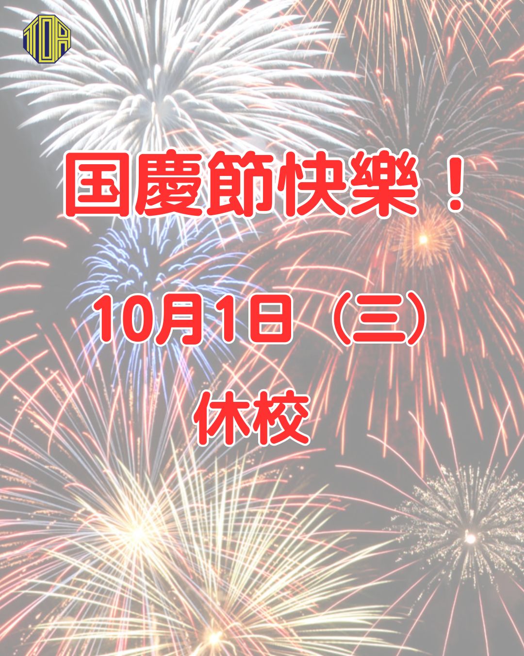 国慶節假期通告/国慶節休暇のお知らせ 2025.10.01 国慶節假期通告/国慶節休暇のお知らせ <中文> 各位同學: 10月1日(星期三)為公眾假期休息一天,敬請留意! <日文> 学生の皆様へ 10月1日(水)は国慶節のため休校となります。 尚、該当するレッスンは全て次回に繰越となりますので、 よろしくお願いいたします。