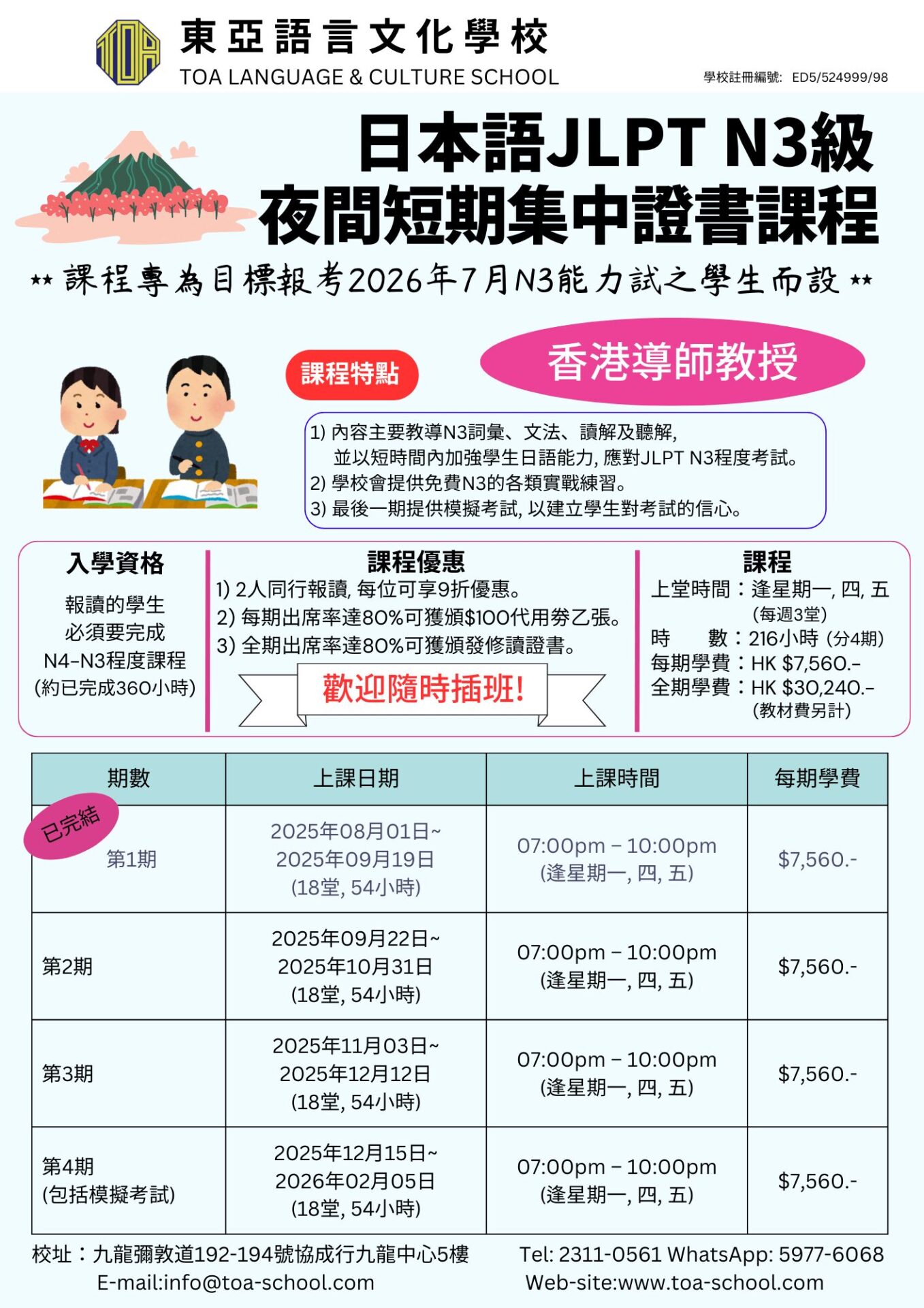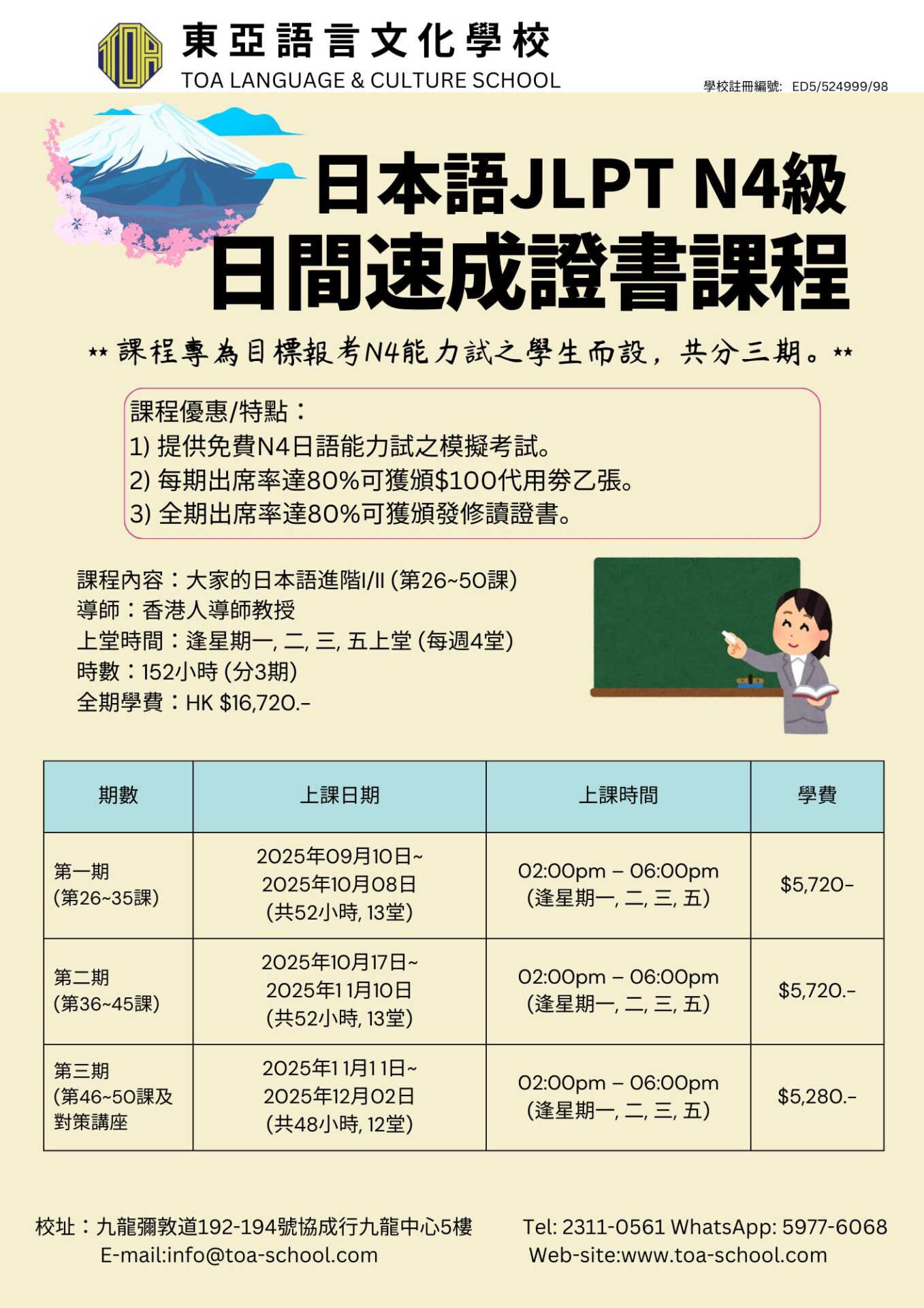 歡迎插班!「日本語JLPT N4級課程(日間速成班)」&「日本語JLPT N3級課程(夜間短期班)」 2025.10.02 歡迎插班!「日本語JLPT N4級課程(日間速成班)」&「日本語JLPT N3級課程(夜間短期班)」 今年12月考N4的人士, 好消息! 透過每期進行的實戰練習或模擬考試,可以快速達成你的目標!! 另外, N3還可以插班, 不容錯過機會! 打算考N5的人士, 也可以參考 日本語JLPT N5-N3級 日間速成證書課程 & 夜間短期集中證書課程 歡迎聯絡致本校, 請查詢更多資訊及報名。 聯絡我們 或 入學報名 info@toa-school.com 23110561 59776068