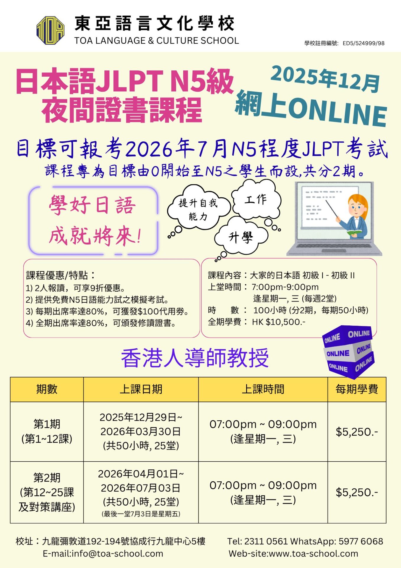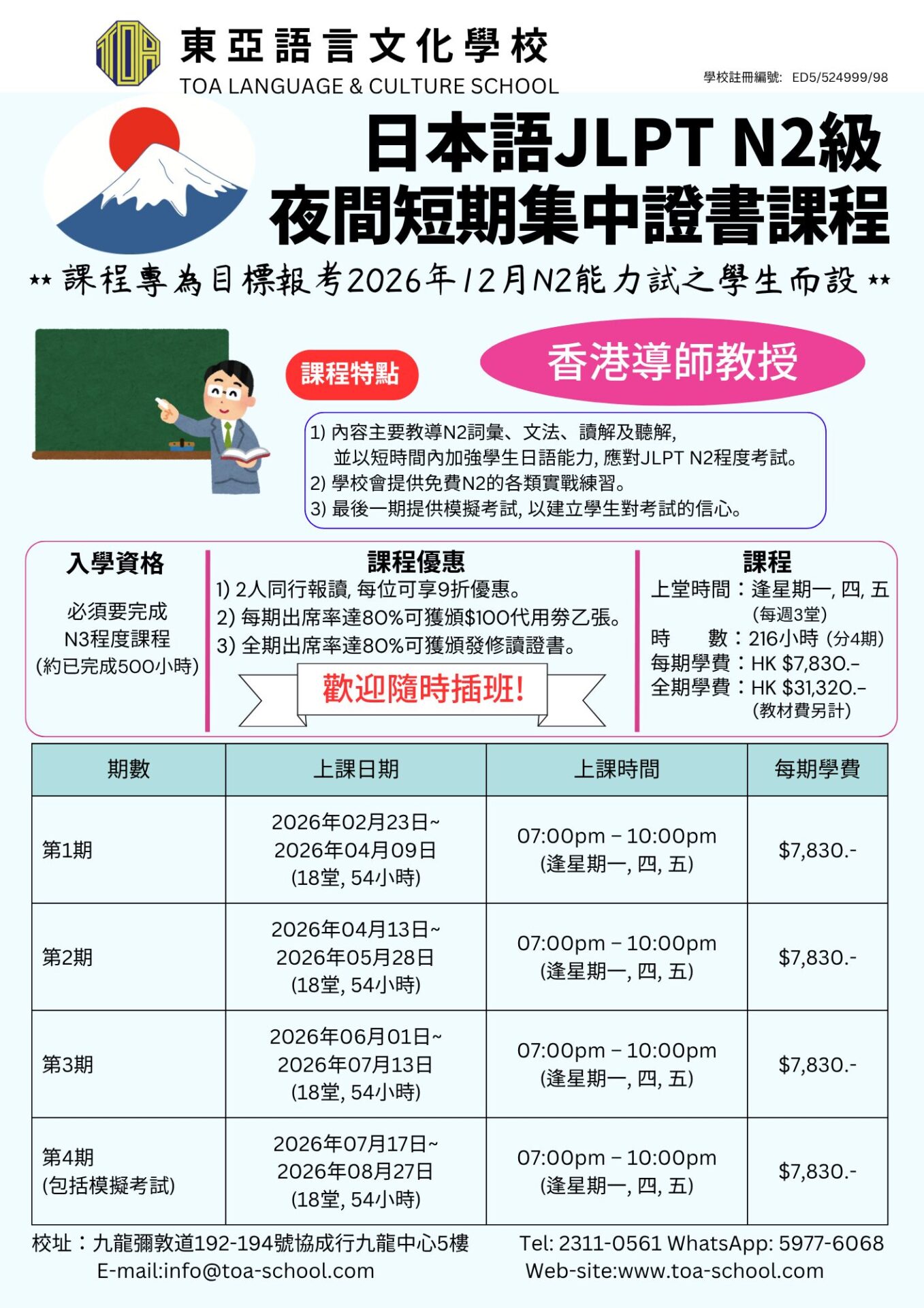 即將開課!N2&N5 ONLINE 夜間短期集中證書課程 2025.12.09 即將開課!N2&N5 ONLINE 夜間短期集中證書課程 2026年有意參加日本語能力試驗的人士,請注意! 本校即將開始最新短期課程,包括ONLINE班。 無論在哪裏上課,透過每期進行的實戰練習或模擬考試, 可以快速達成你的目標。 報名從速! 也歡迎N3&N4插班, 請參考 日本語JLPT N5-N2級 日間速成證書課程 & 夜間短期集中證書課程 歡迎聯絡致本校, 請查詢更多資訊及報名。 聯絡我們 或 入學報名 info@toa-school.com 23110561 59776068
