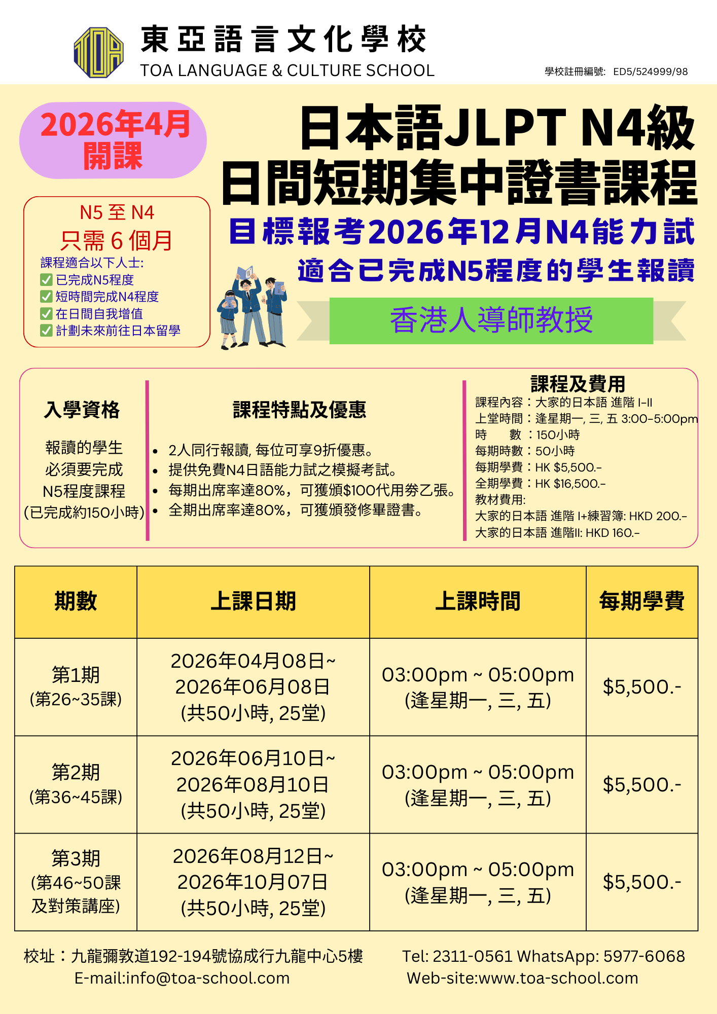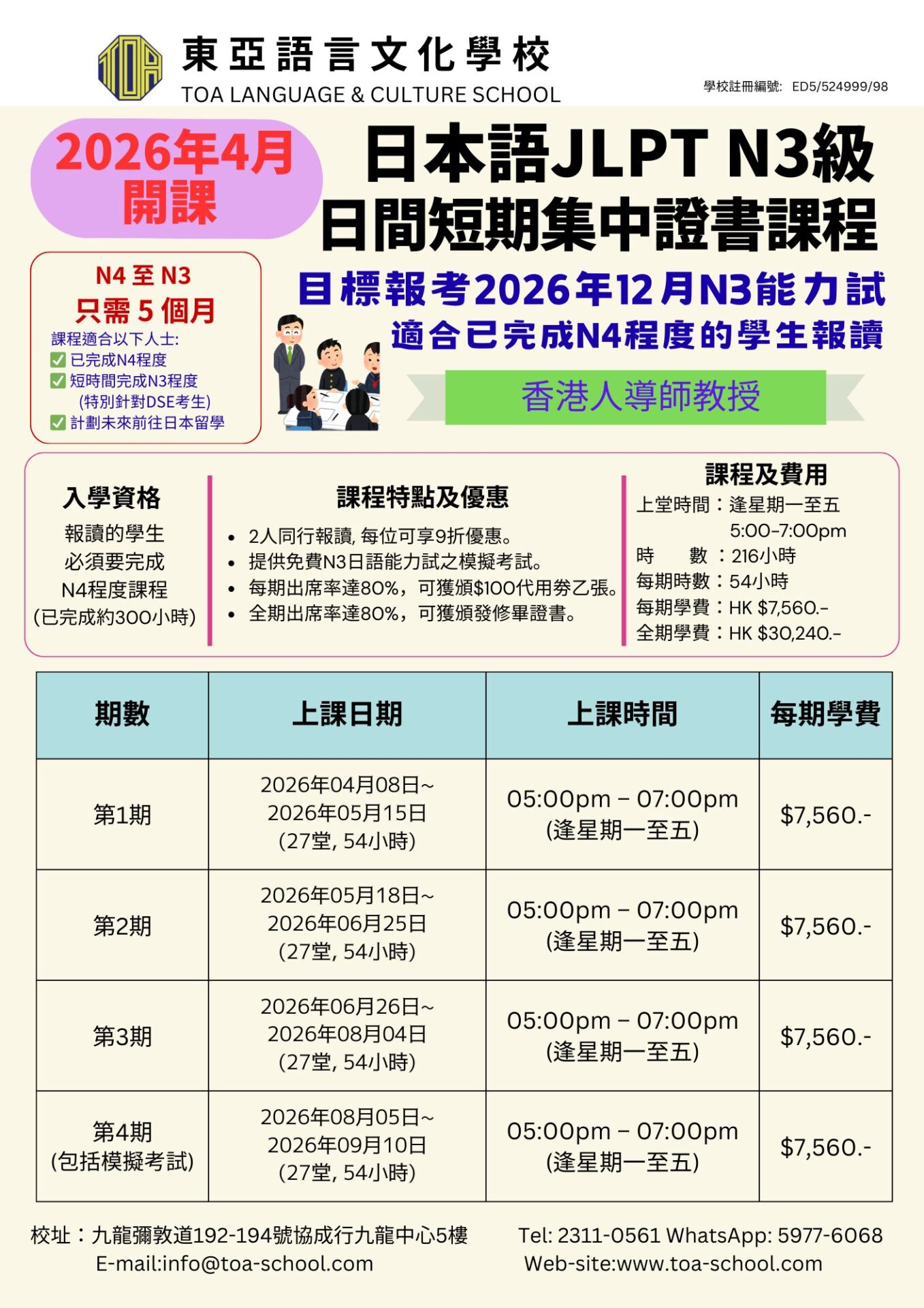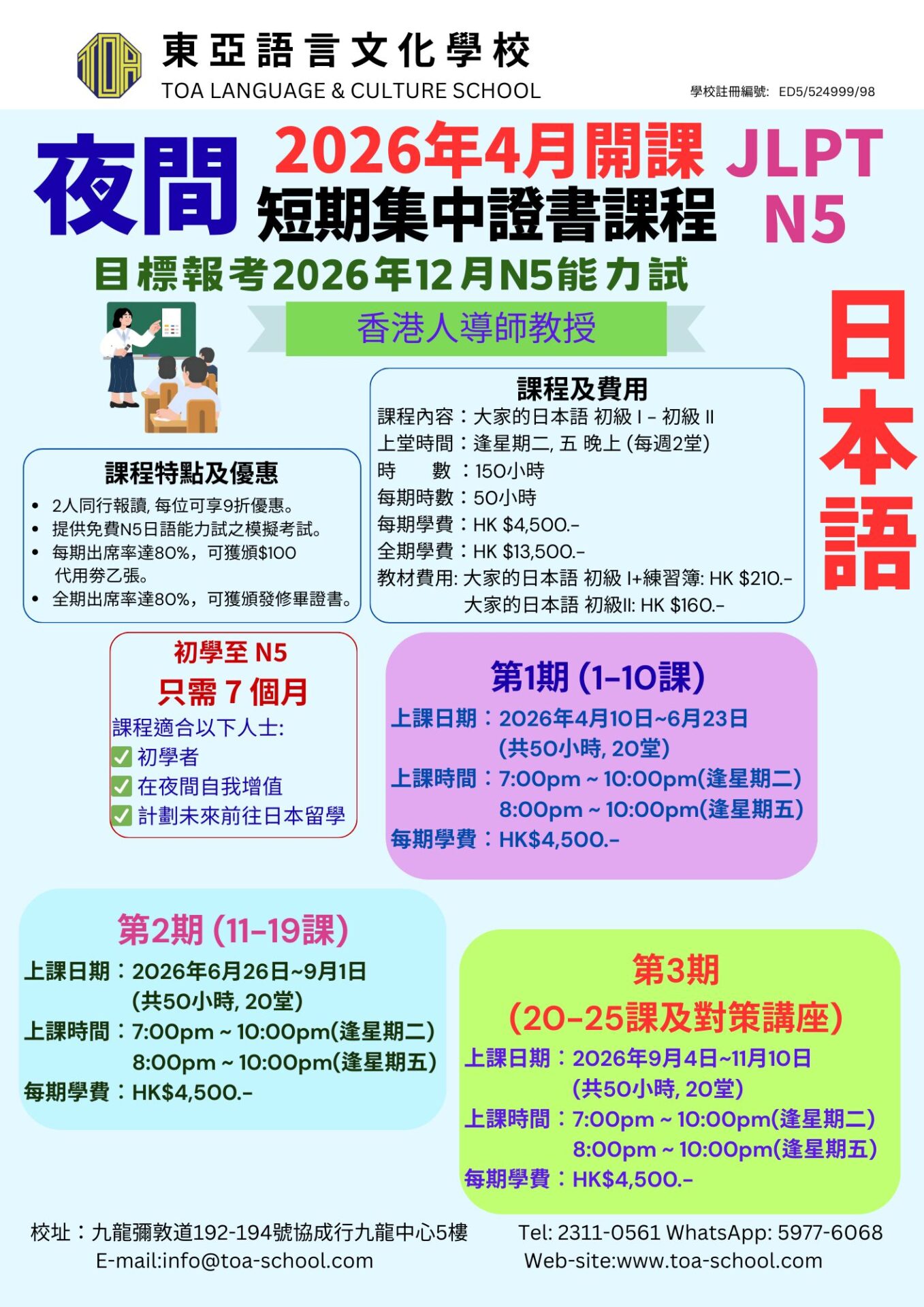 即將開課!日本語JLPT N5-N3級 日間速成證書課程 & 夜間短期集中證書課程 2026.02.19 即將開課!日本語JLPT N5-N3級 日間速成證書課程 & 夜間短期集中證書課程 詳情請參考 日本語JLPT N5-N2級 日間速成證書課程 & 夜間短期集中證書課程 歡迎聯絡致本校, 請查詢更多資訊及報名。 聯絡我們 或 入學報名 info@toa-school.com 23110561 59776068