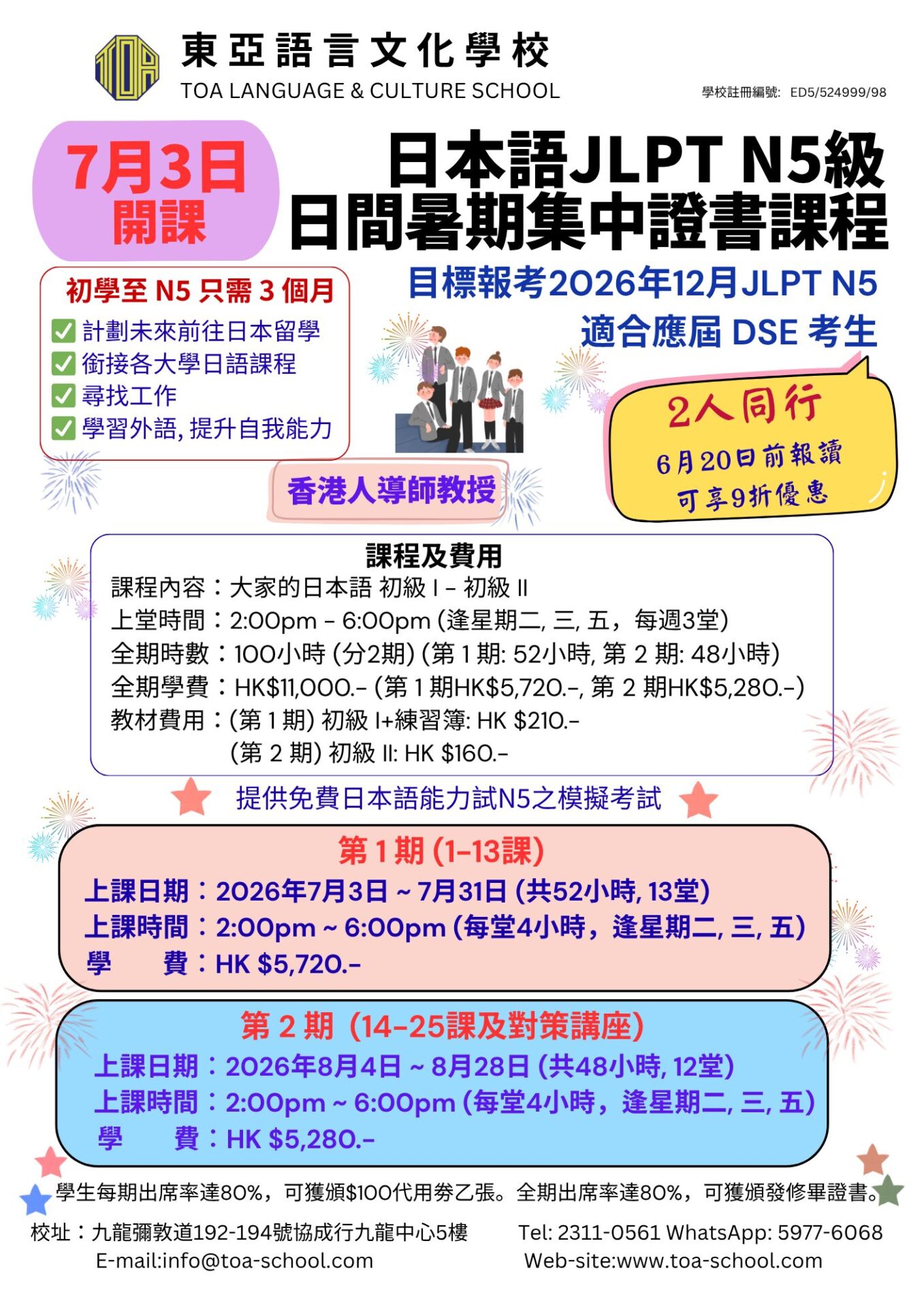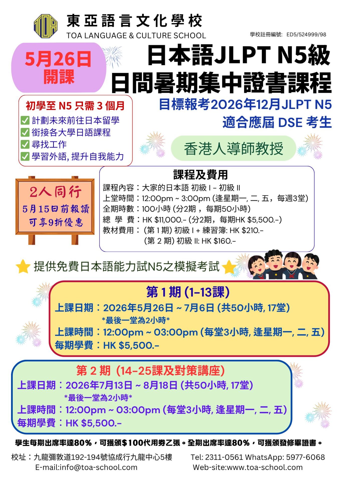 5月及7月開課!日本語JLPT N5級日間暑期集中證書課程 2026.03.26 5月及7月開課!日本語JLPT N5級日間暑期集中證書課程 早鳥優惠第二彈! 於5月15日或之前報到5月開課課程及 6月20日或之前報到7月開課課程可享9折優惠!! 青少年暑期日本語課程 歡迎聯絡致本校, 請查詢更多資訊。 聯絡我們 或 入學報名 info@toa-school.com 23110561 59776068