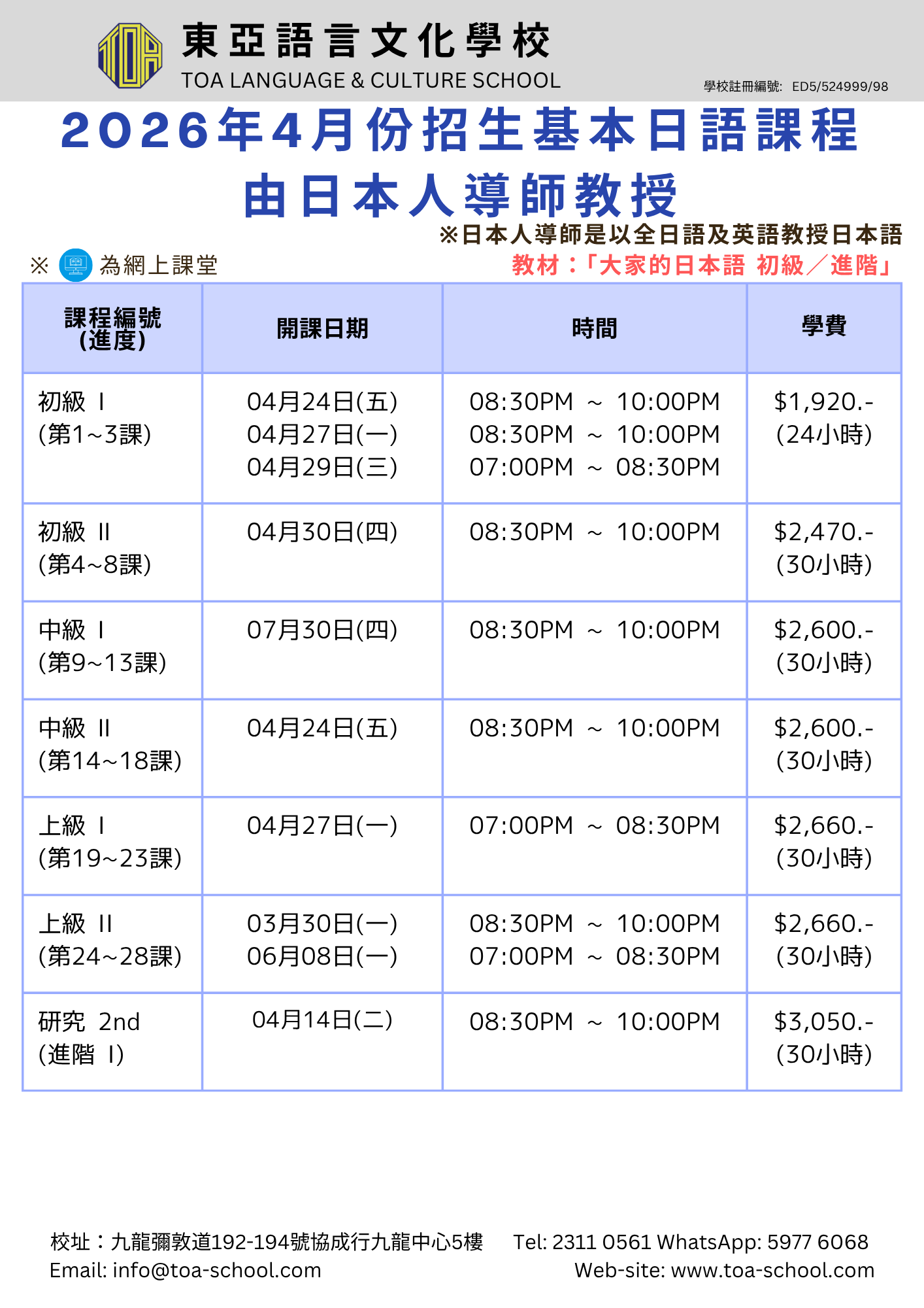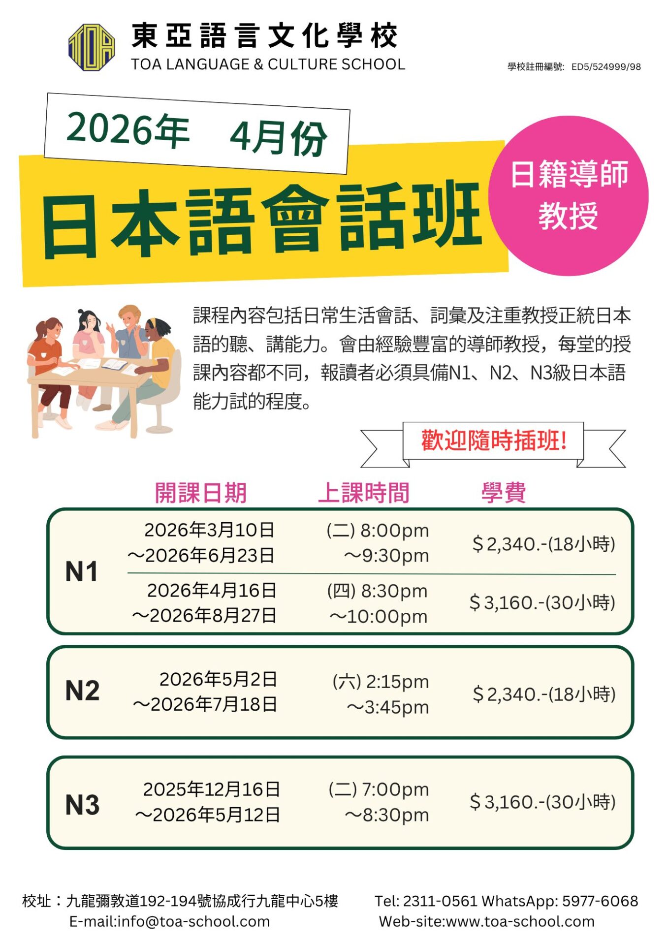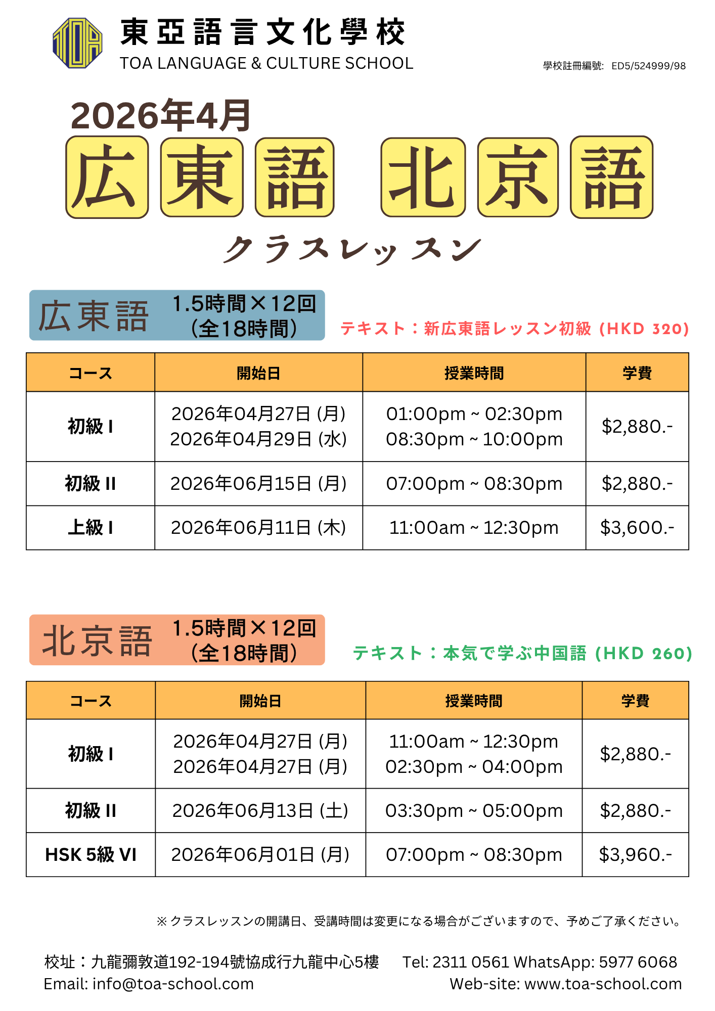 開始招日語 4月生!/広東語・北京語 4月生募集スタート!